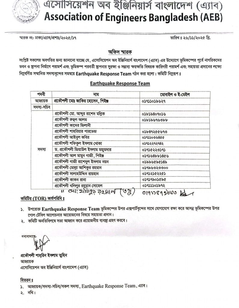ভূমিকম্পের পূর্বে নাগরিকদের ভবন ও স্থাপনা নির্মাণ পরামর্শ এবং ভূমিকম্প পরবর্তী স্থাপনার সুরক্ষা ও সম্ভাব্য ক্ষয়ক্ষতি বিষয়ক কারিগরী পরামর্শ এবং সহায়তা প্রদানের লক্ষ্যে ১৫ সদস্যবিশিষ্ট ভূমিকম্প রেসপন্স টিম গঠন করেছে এসোসিয়েশন অব ইঞ্জিনিয়ার্স বাংলাদেশ (এ্যাব)।