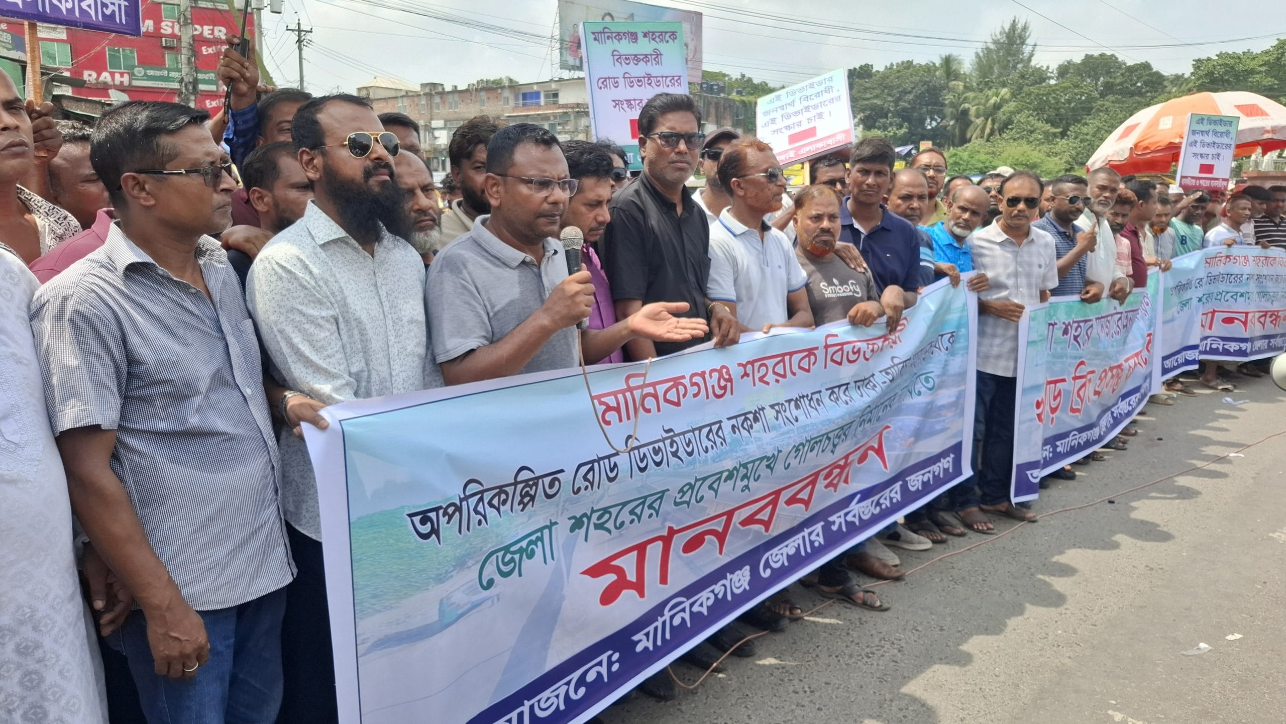 মানিকগঞ্জ শহরকে বিভক্তকারী অপরিকল্পিত রোড ডিভাইডার অপসারণ করে শহরের প্রবেশমুখে গোলচত্ত্বর ও ফ্লাইওভারের দাবিতে মানববন্ধন করেছে মানিকগঞ্জবাসী।