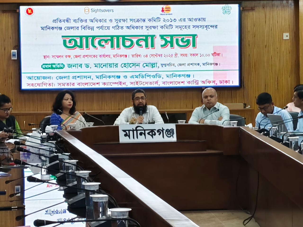 প্রতিবন্ধী ব্যক্তির অধিকার ও সুরক্ষা সংক্রান্ত কমিটির আওতায় মানিকগঞ্জ জেলার বিভিন্ন পর্যায়ে গঠিত অধিকার সুরক্ষা কমিটিগুলোর সদস্যদের নিয়ে আলোচনা সভা অনুষ্ঠিত হয়েছে। আজ (বৃহস্পতিবার) জেলা প্রশাসকের সম্মেলন কক্ষে এই সভার আয়োজন করে যৌথভাবে জেলা প্রশাসন ও মানিকগঞ্জ ডিজঅ্যাবল পিপলস অর্গানাইজেশন টু ডেভেলপমেন্ট (এমডিপিওডি)।